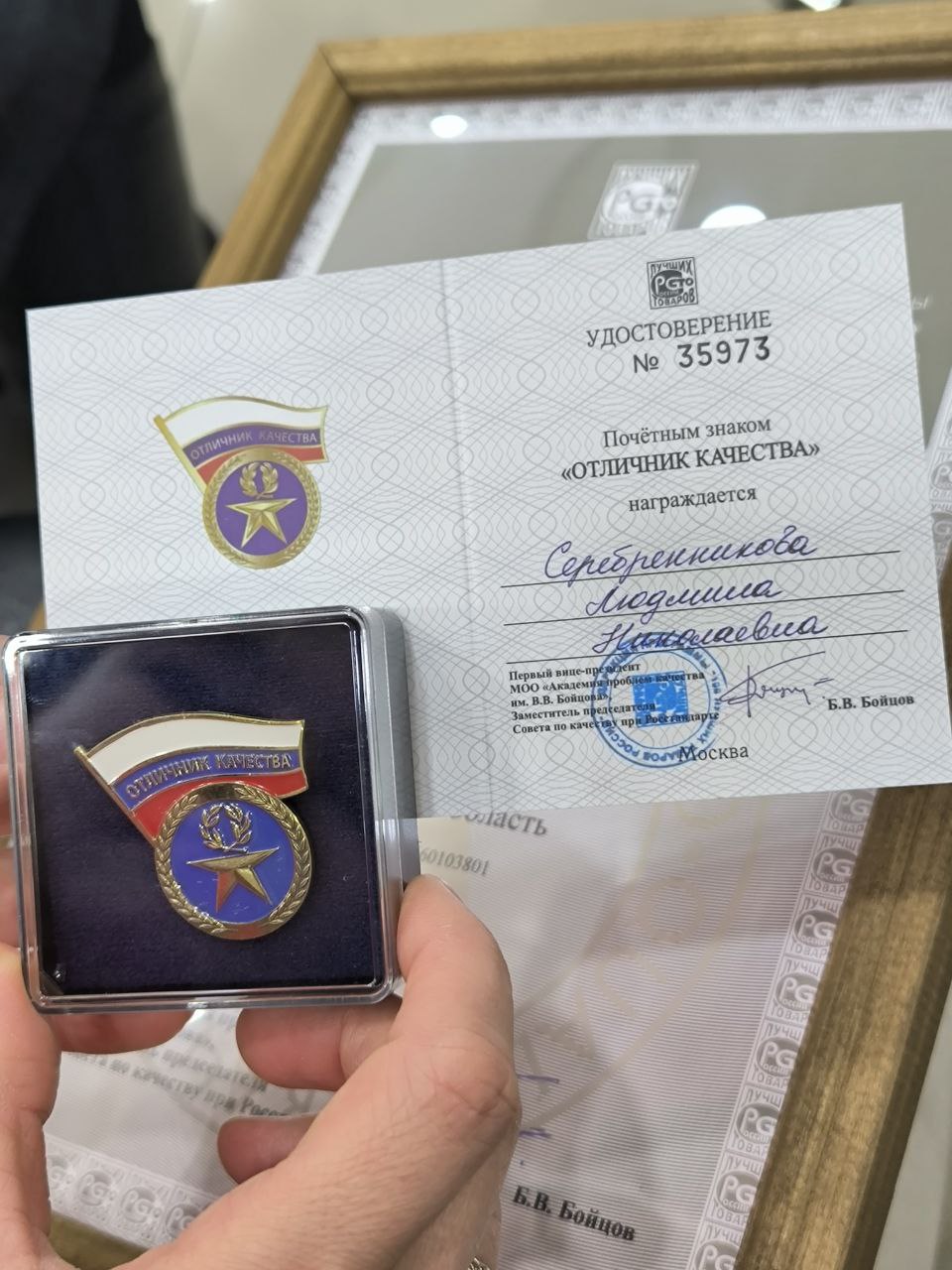 Ещё одна приятная новость – на церемонии награждения Диляре Айратовне передали почётный знак «Отличник качества» в виде значка. Это персональная награда Всероссийского конкурса программы «100 лучших товаров России», она присуждается лучшим работникам предприятий и организаций, товары которых стали финалистами конкурса. Значок «Отличник качества» в «Обуховском» вручили старшей медсестре поликлиники Л.Н. Серебренниковой. Стаж работы Людмилы Николаевны в санатории – более 40 лет, её профессиональные и личные качества проверены временем и подтверждены опытом. Поздравляем Людмилу Николаевну с наградой!